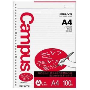●書き心地で選べる/筆記時の力の強さや筆記速度、よく使う筆記具などにより、好みに合わせて「さらさら書ける」タイプと「しっかり書ける」タイプの2種類の書き心地から選べます。●使いやすく工夫した罫内容/キャンパスノートと同じようにタテ線が正確に引けるよう、センターと左端に三角形のメモリ点を配置しました。●筆記に最適なオリジナル原紙/「さらさら」「しっかり」どちらの原紙もにじみにくく、インクが裏に透けにくいコクヨオリジナル原紙を使用しています。また、長期保存に適した中性紙です。サイズ:A4:穴数:30穴:罫内容:普通横罫:行数:35行:枚数:100枚JAN:4901480085296